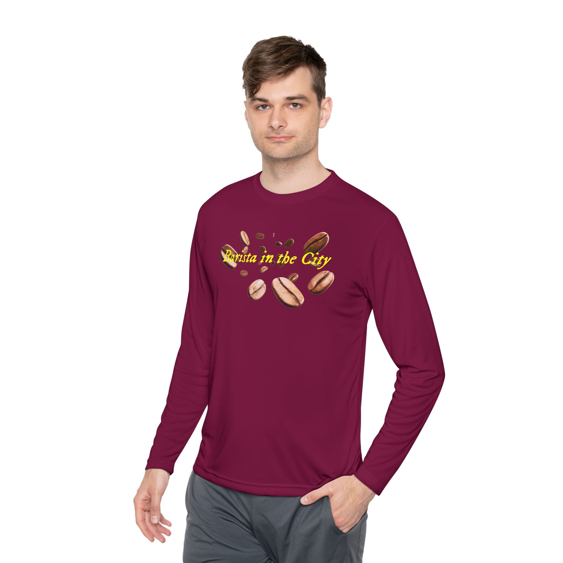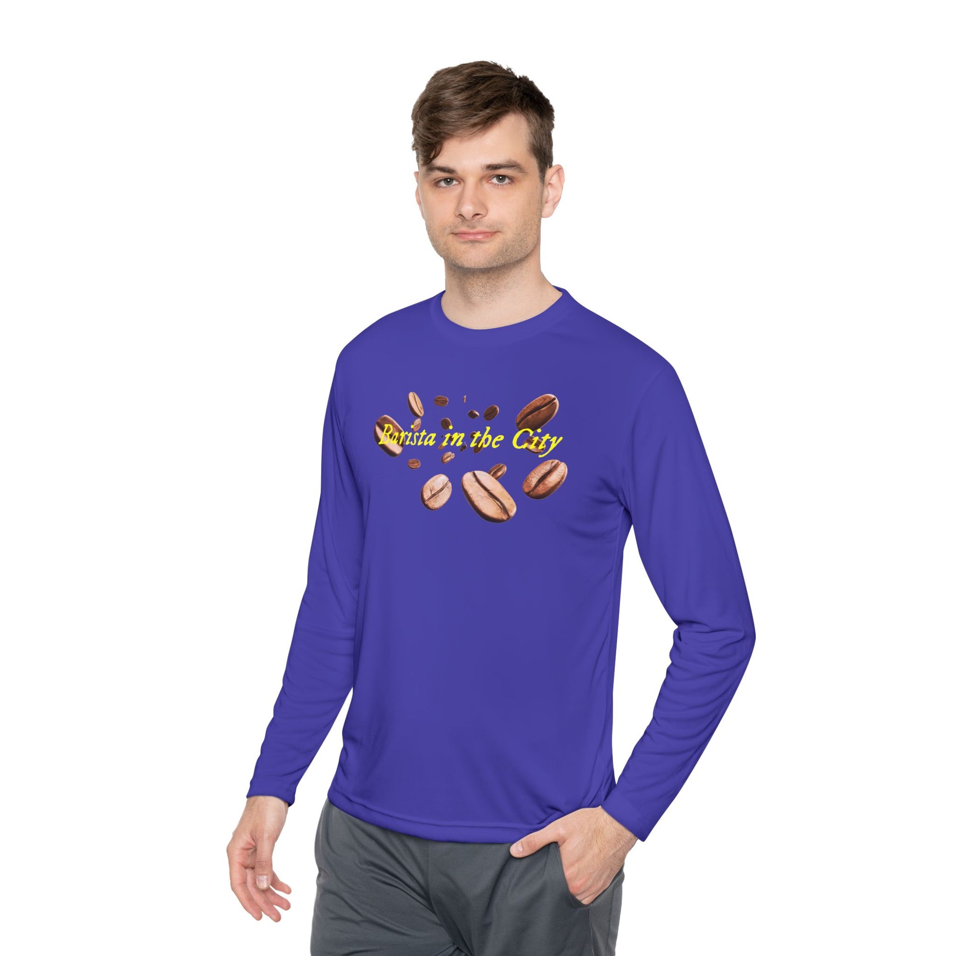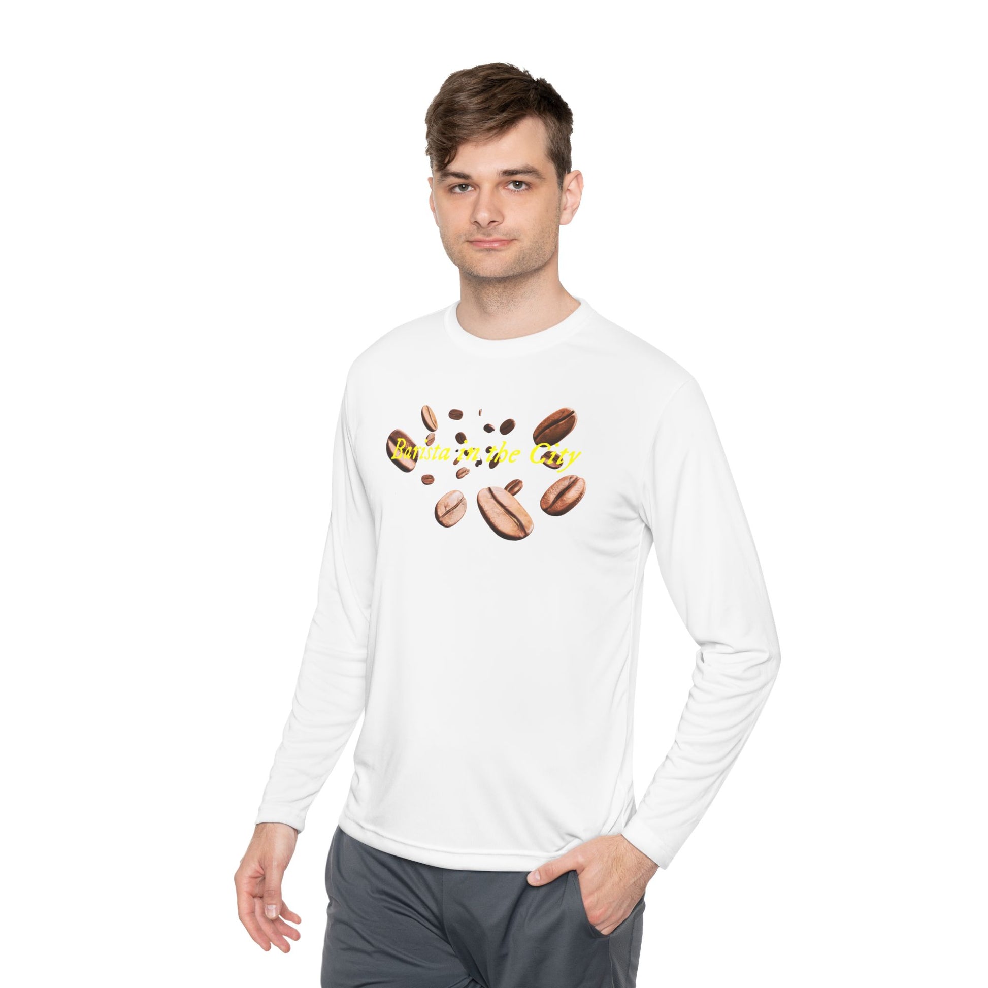 A lightweight long sleeve that moves with you through the rhythm of the city. Soft, airy fabric keeps you cool on morning shifts and late runs between cafés. The barista-themed print sits crisp and clear across the chest, a subtle nod to craft and routine—an everyday uniform that feels purposeful, not staged. Wear it layered under an apron on busy service days or solo on crisp mornings when you’re tasting, dialing in shots, or sharing a slow conversation over counter light. The athletic cut follows gestures without clinging. It’s for people who care about function and quiet details: commuters, café teams, and anyone who treats coffee like craft. Bring it to market nights, back‑of‑house shifts, or weekend pop‑ups; it blends into the workday and stands out to those who notice the small things.