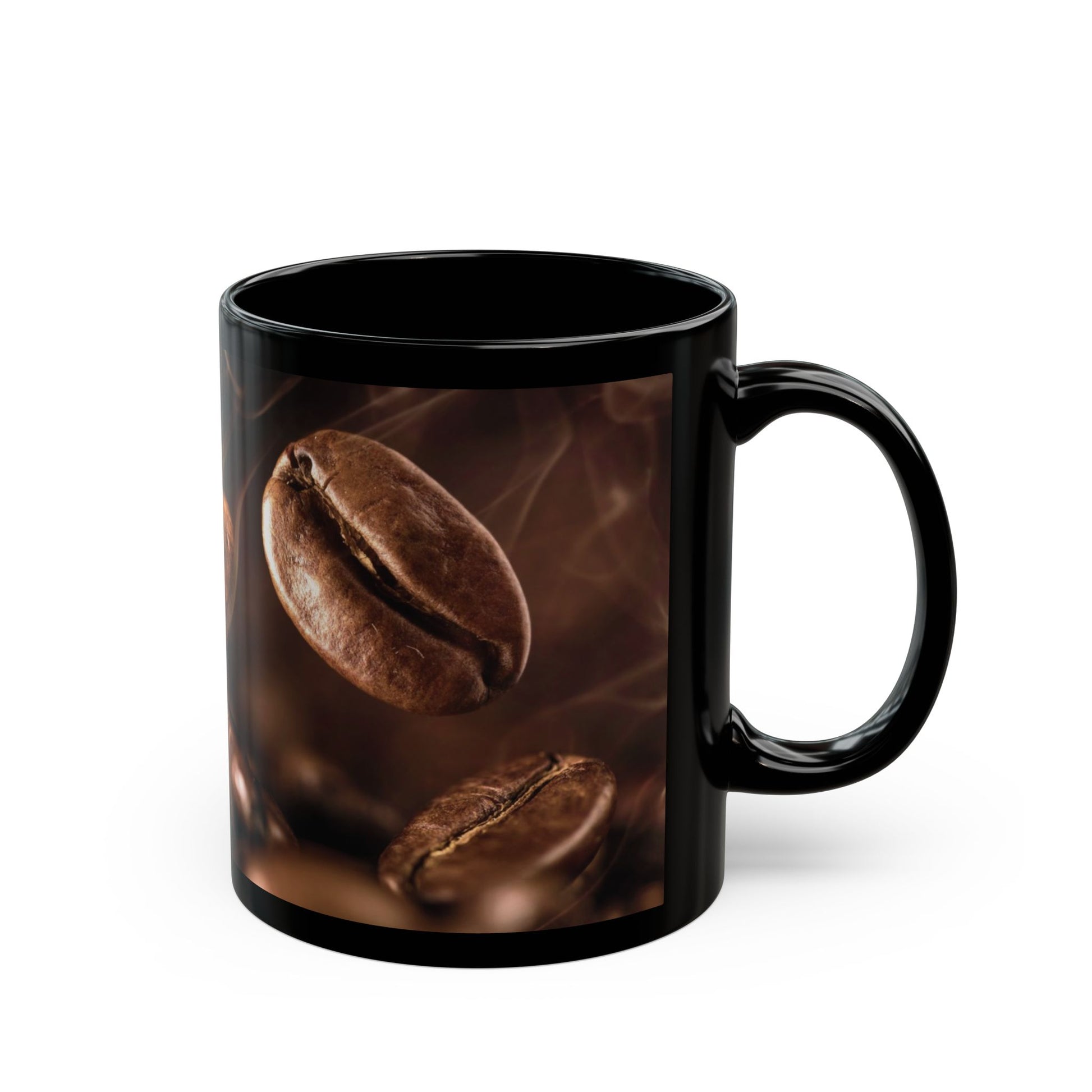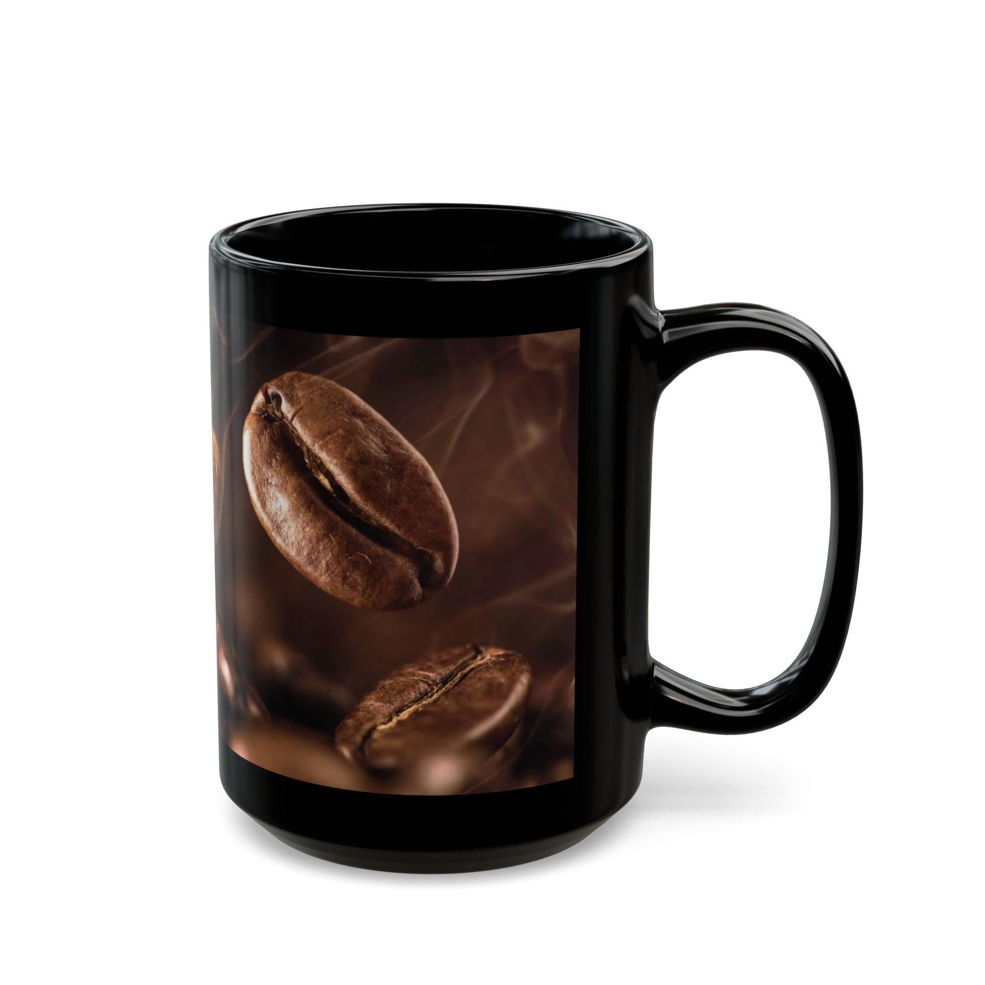 This glossy black ceramic mug brings the rich ritual of coffee to your hands. Deep, roasted coffee beans swirl across the surface in warm, photo-real tones that glow against the black background. It feels like a quiet morning in a tiny café: steam rising, the first sip warming your palms, and the aroma filling the room. Built for daily use, the comfortable C-shaped handle and two size options mean you can reach for the stronger 15oz or keep it simple with an 11oz. Whether it joins your work-from-home routine or sits on the kitchen counter as part of a slow breakfast, it adds a little handcrafted café mood to ordinary moments.